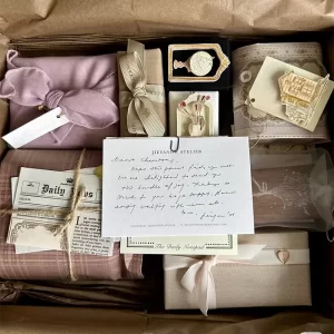 We design custom gift packaging that reflects your style: from hand-tied fabrics and branded tags to themed embellishments (like vintage-inspired accents, custom labels, or personalized notes, as seen in the curated set above). Every detail is crafted to make your gift feel exclusive and memorable.